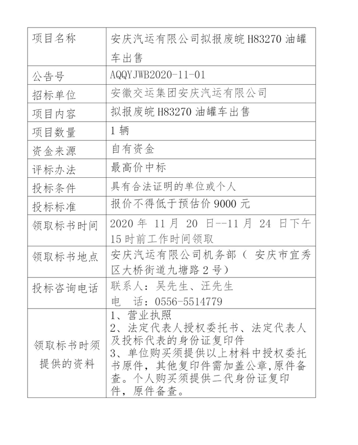 安慶汽運公司擬報廢皖H83270油罐車售公告