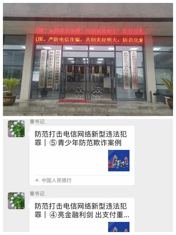 公司領導高度重視,精心組織,在公司電子屏和公交車尾電子屏循環(huán)播放宣傳標語,在公司職工微信群轉發(fā)《致全市財務人員的一封信》、《致全體學生及家長的一封信》,進一步提高職工及廣大人民群眾對各類電信網(wǎng)絡詐騙的自我防范意識,增強法治意識,提高維權能力,切實打擊電信網(wǎng)絡詐騙。