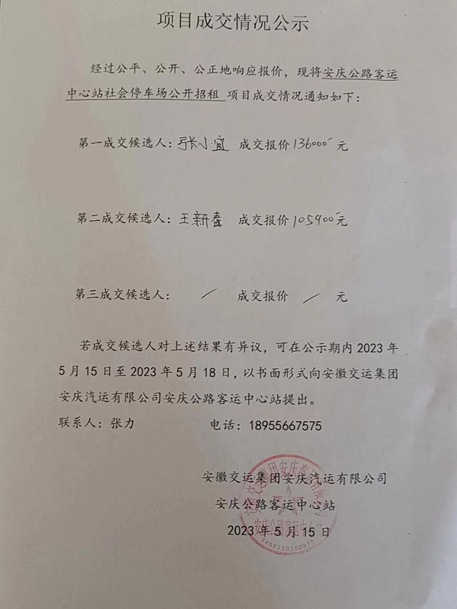 安慶中心站社會停車場公開招租結(jié)果公示